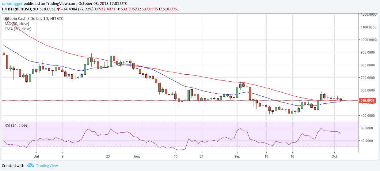 Bitcoin Cash has been trying to hold above the moving averages since Sept. 29 but hasn’t been able to sustain above $550. The strongest breakouts never look back. If the cryptocurrency doesn’t resume its upward move quickly, it is likely to attract selling.