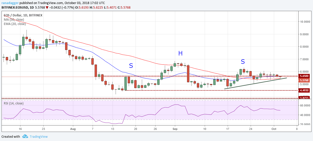The bulls are attempting to hold EOS above the 50-day SMA, which shows buying at lower levels. A break of this support can sink it to the next support at $5. The flat moving averages and the RSI close to 50 levels shows equilibrium between the bulls and the bears.