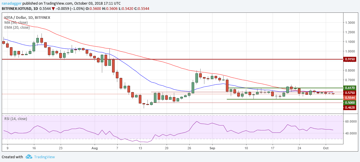 IOTA has been trading inside a range of $0.5000–$0.6170 since Sept. 6. An attempt to break out on Sept. 21 could not sustain and prices turned back the very next day.