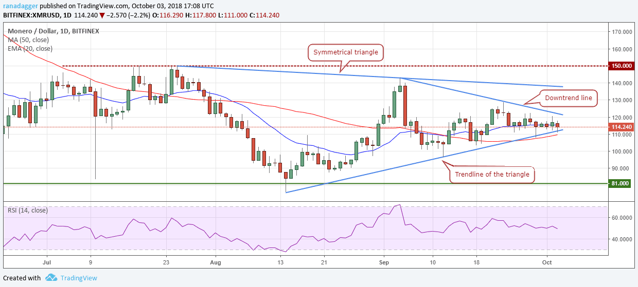 Monero has been trading close to the 20-day EMA for the past five days. The price has been sandwiched between the downtrend line and the 50-day SMA.
