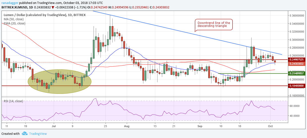 Stellar again turned down from the downtrend line of the descending triangle on Oct. 1 and broke below the 20-day EMA.