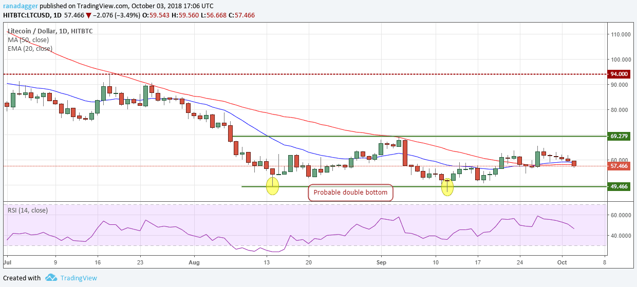 Litecoin continues to trade inside the range of $49.466–$69.279. A consolidation after a long downtrend shows that selling has exhausted but the buyers are still not back in full force.